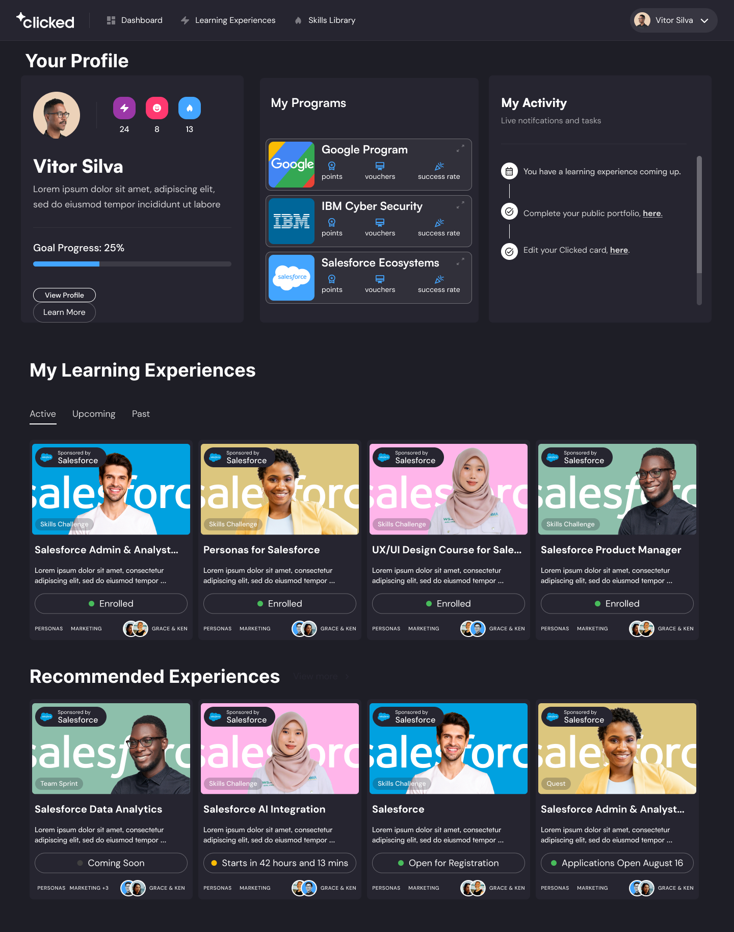 I redesigned Clicked to make career learning simple and intuitive—reducing friction, clarifying navigation, and streamlining onboarding from multiple clicks to one. Learners can now join experiences with confidence, track progress in a unified dashboard, and focus on growth instead of getting lost in the process.